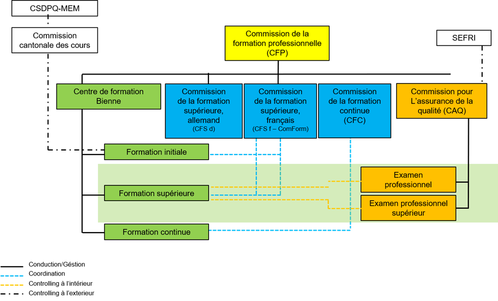 La commission de la formation supérieure est composée de 3 à 6 membres ou selon nécessité. Le responsable du centre de formation est également membre de la commission des cours.